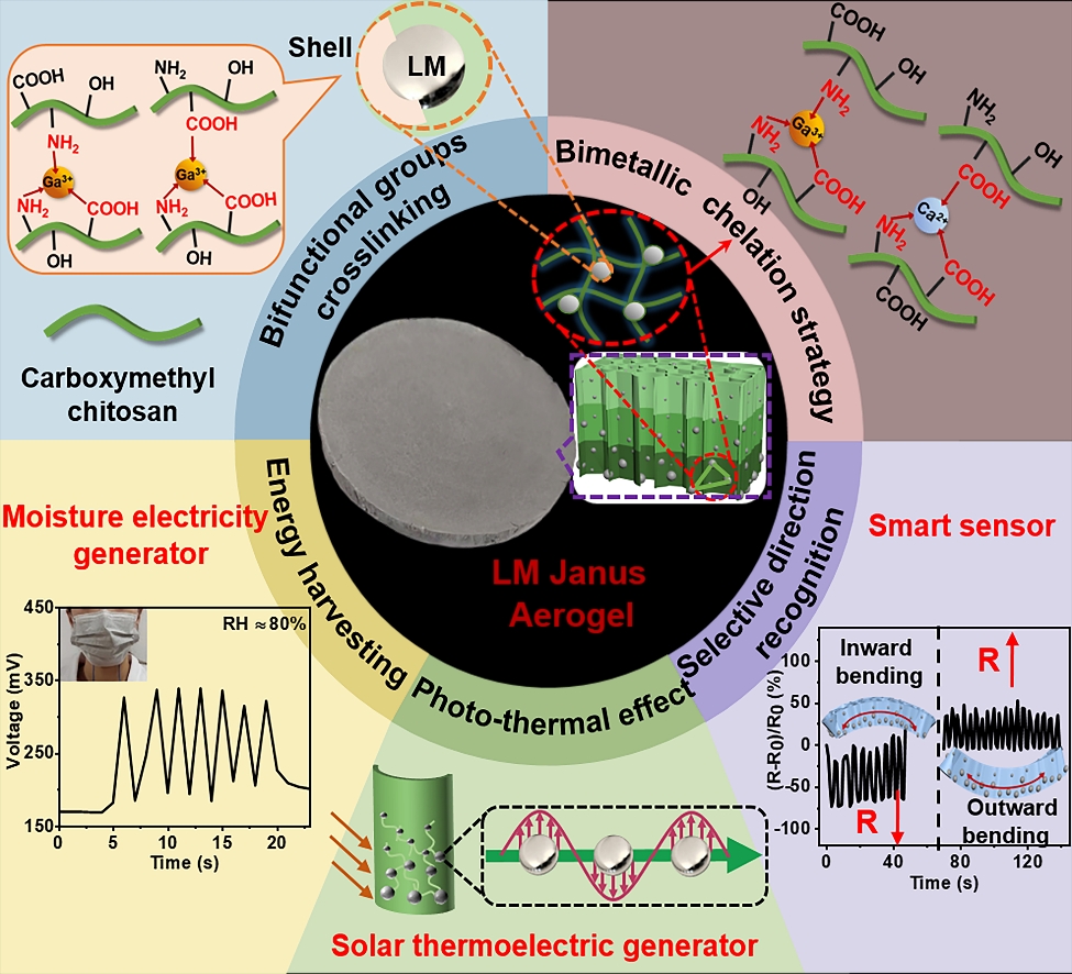 液态金属具有良好的导电/导热特性和良好的流动性,是制备功能化柔性电子的理想材料。但是液态金属超高的表面张力,难以实现加工成形和功能化。虽然通过微纳化处理,能够有效降低其表面张力,但是由于其高密度和活跃的表面特性,获得稳定的液态金属微纳液滴仍然是一个巨大的挑战。针对以上问题,该团队提出双官能团协同锚定策略,在液态金属微纳液滴表面构建了坚固的外壳。即在羧甲基化壳聚糖(CMCS,含有丰富的羧基和胺基)溶液中对液态金属进行超声,制备了化学稳定性较高(> 7 d)的液态金属分散液,再通过定向冷冻干燥的方法制备出具有Janus结构的气凝胶。