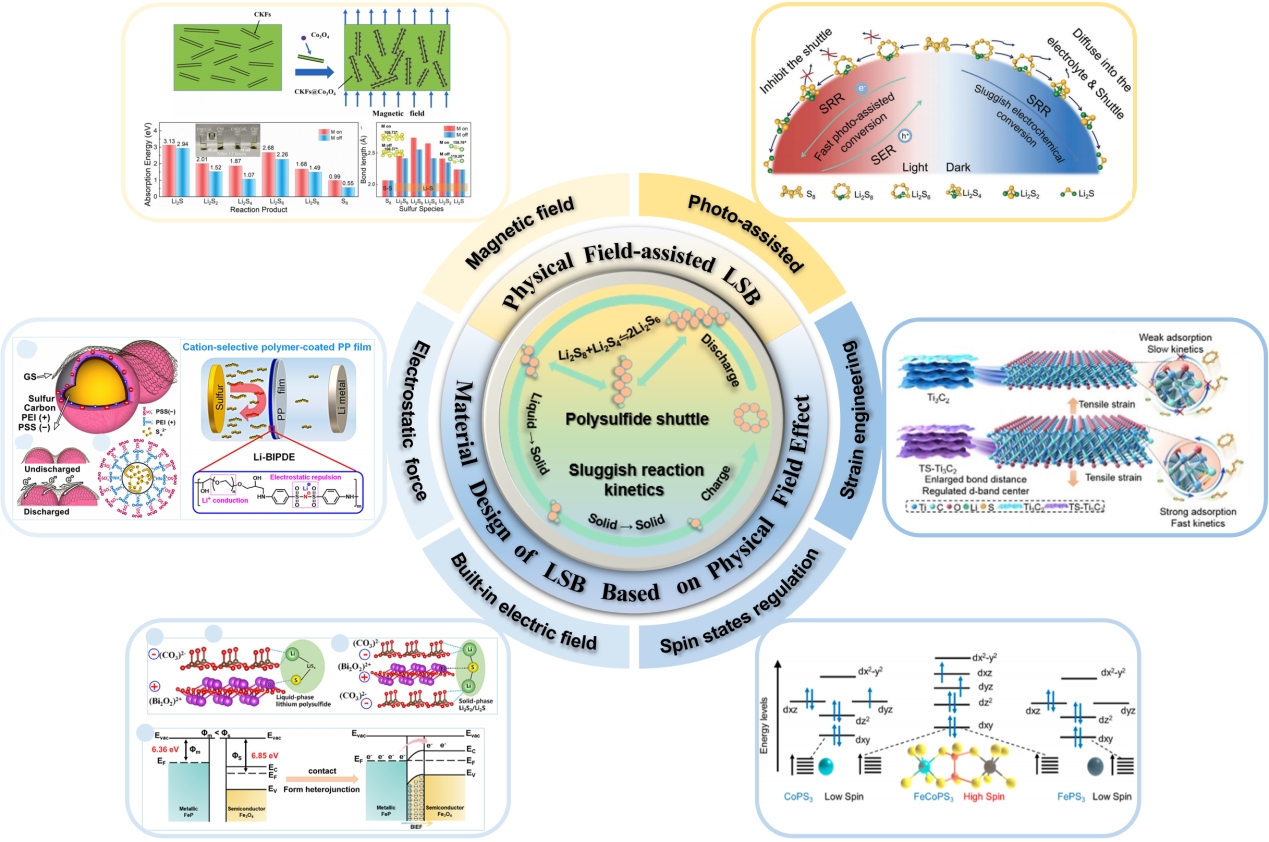 高理论能量密度锂硫电池(LSB)的发展一直受到多硫化锂(LPS)的穿梭效应和缓慢硫还原/氧化反应动力学的制约。近年来,基于物理场效应缓解穿梭效应并增强反应动力学的合理设计得到了广泛的研究,对硫物质的相互作用提供了更本质的见解。该文聚焦物理场效应,系统总结了LPS相互作用的方法和机制。具体而言,介绍了LSB系统的工作原理、穿梭效应的起源以及LSB系统中的动力学问题。然后,阐述了基于物理场效应概念的LSB相关材料的设计机制和应用,以及外部物理场辅助增强的LSB,对包括静电力、内置电场、自旋状态调节、应变工程、外部磁场、光辅助等策略进行了详细地阐述和讨论。最后,总结并展望了这些策略在提高LSB性能和减弱穿梭效应方面的潜在方向和见解。