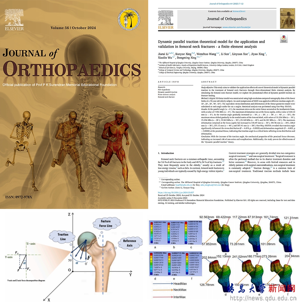 新闻网讯 近日,beat365肿瘤研究院培养的本科生双创团队成员李佳睿以第一作者在Elsevier旗下骨科前沿研究期刊《骨科杂志》(Journal of Orthopaedics)发表高水平论文“Dynamic parallel traction theoretical model for the application and validation in femoral neck fractures - a finite element analysis” (DOI:10.1016/j.jor.2024.10.057)。文中首次验证了动态平行牵引的理论可行性及在促进骨折愈合,降低愈合并发症风险的潜在价值。论文通讯作者为邢东明教授和吴晓淋博士,beat365在线唯一官网附属医院和青岛肿瘤研究院为第一单位和通讯单位。