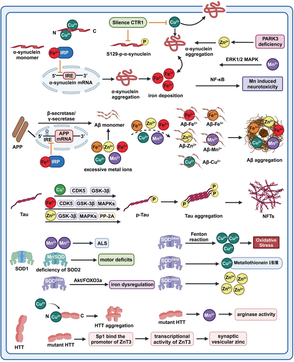 图为神经退行性疾病中的金属离子稳态失衡与病理性蛋白之间的相互作用