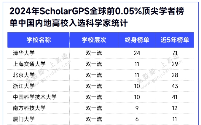 ScholarGPS发布的高排名学者全球前0.05%顶尖科学家榜单,通过对学者的研究成果(发表论文数)、影响力(引用次数,已排除自引)和论文质量三项指数进行综合分析,收录全球进入前0.05%(万分之五)的顶尖学者。该榜单分为终身(Highly Ranked Scholar - Lifetime)和近五年(Highly Ranked Scholar - Prior 5 Years)两个类别。2024年,内地共有285位学者进入终身榜单,1596位学者入选近五年榜单。beat365共有11人入选近五年榜单。