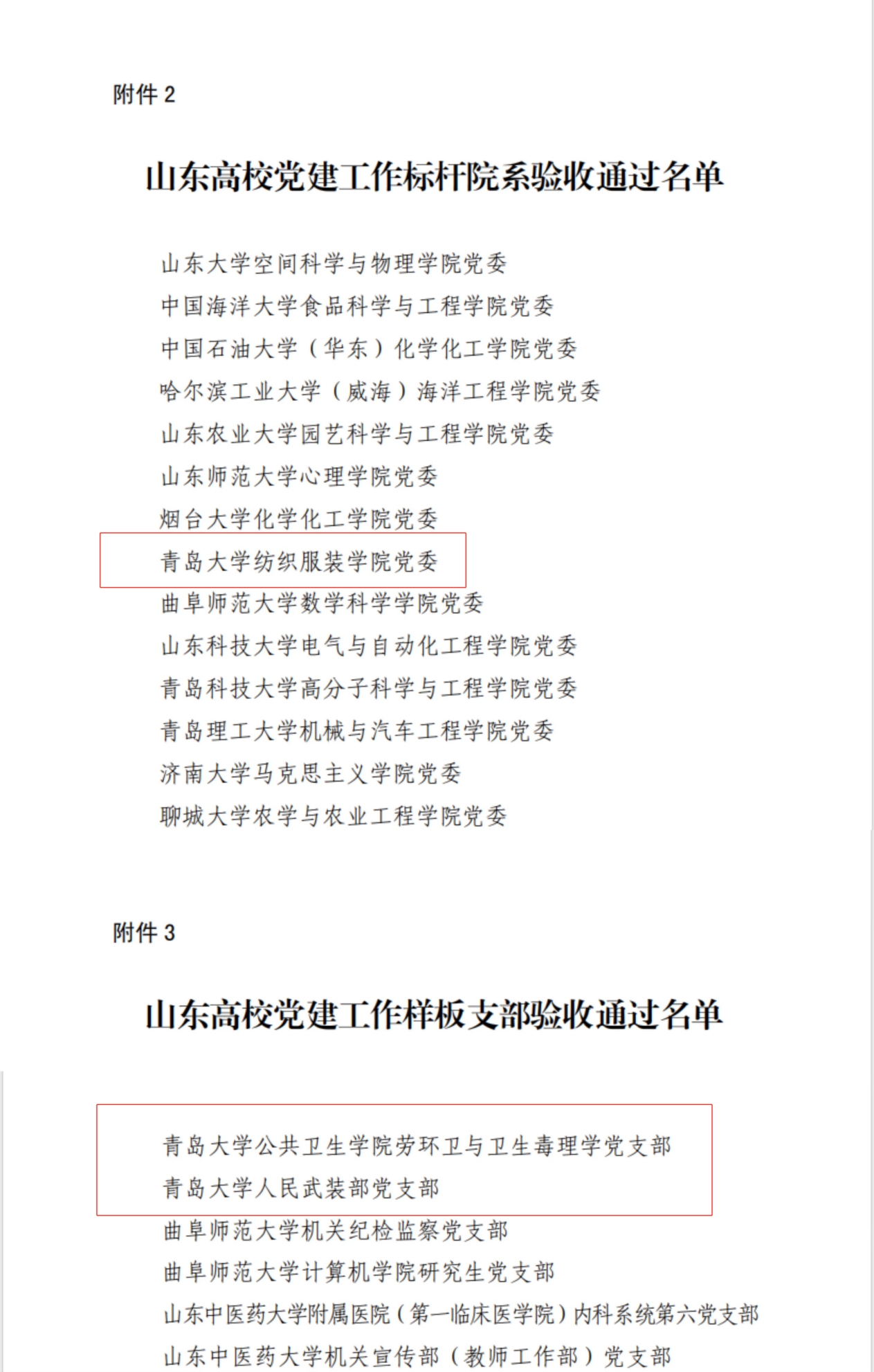 新闻网讯 近日,山东省委教育工委公布了第二批山东高校党建“双创”培育创建工作验收通过名单,beat365纺织服装学院党委、公共卫生学院劳环卫与卫生毒理学党支部、人民武装部党支部三个党组织顺利通过验收。