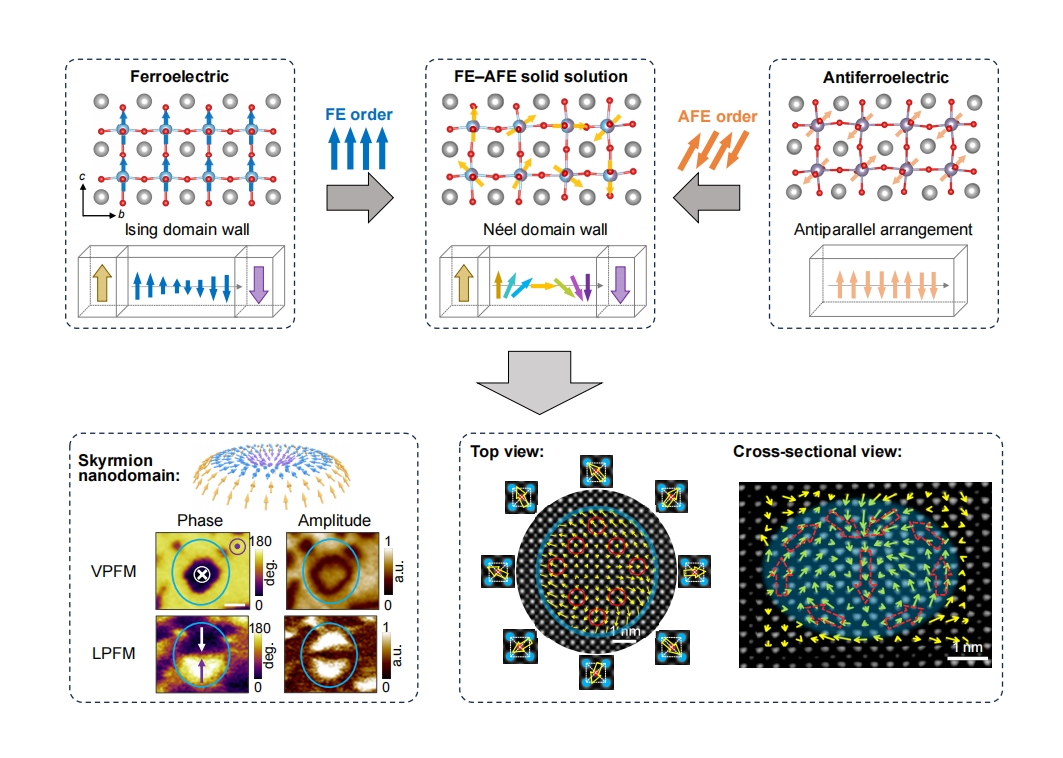 最近,极性拓扑畴,特别是极性斯格明子(Polar skyrmion)受到业界广泛关注,其具有手性、负电容、场控二次谐波等新奇物性,并且这种拓扑孤子可以稳定在原子尺度,在超高密度数据存储、负电容低功耗场效应器件以及高灵敏太赫兹成像等领域显示出巨大应用潜力,这推动了铁电拓扑电子学在新一代信息技术的持续创新发展。然而,铁电体的“电极化-晶格”强耦合使得极性斯格明子成为能量介稳态。目前,其仅存在于少数借助复杂薄膜结构来平衡能量间相互作用的材料体系中,限制了相关电子学器件的设计、制备和CMOS系统集成。因此,探索新的极性斯格明子材料体系对于拓扑电子学的发展十分重要,但同时由于苛刻的力、电边界条件充满了挑战。我们注意到极性斯格明子产生的两个关键因素,即“电偶极子转动”和“非共线极化织构有序化”,提出基于铁电-反铁电固溶体的斯格明子材料体系。固溶体中铁电序与反铁电序共存,其能量相互竞争导致电偶极子旋转,当固溶成分恰当时,非共线电偶极子有序化形成如Néel畴壁等排列并产生斯格明子拓扑织构。该体系化学组分简单,易于制备且鲁棒性强,蕴含了拓扑极性织构形成的新机制,使得斯格明子电畴能够广泛存在于陶瓷和薄膜两种材料形态中,这不仅为极性拓扑相的理论和实验研究提供了广阔的平台,还促进了铁电电子学的创新发展。