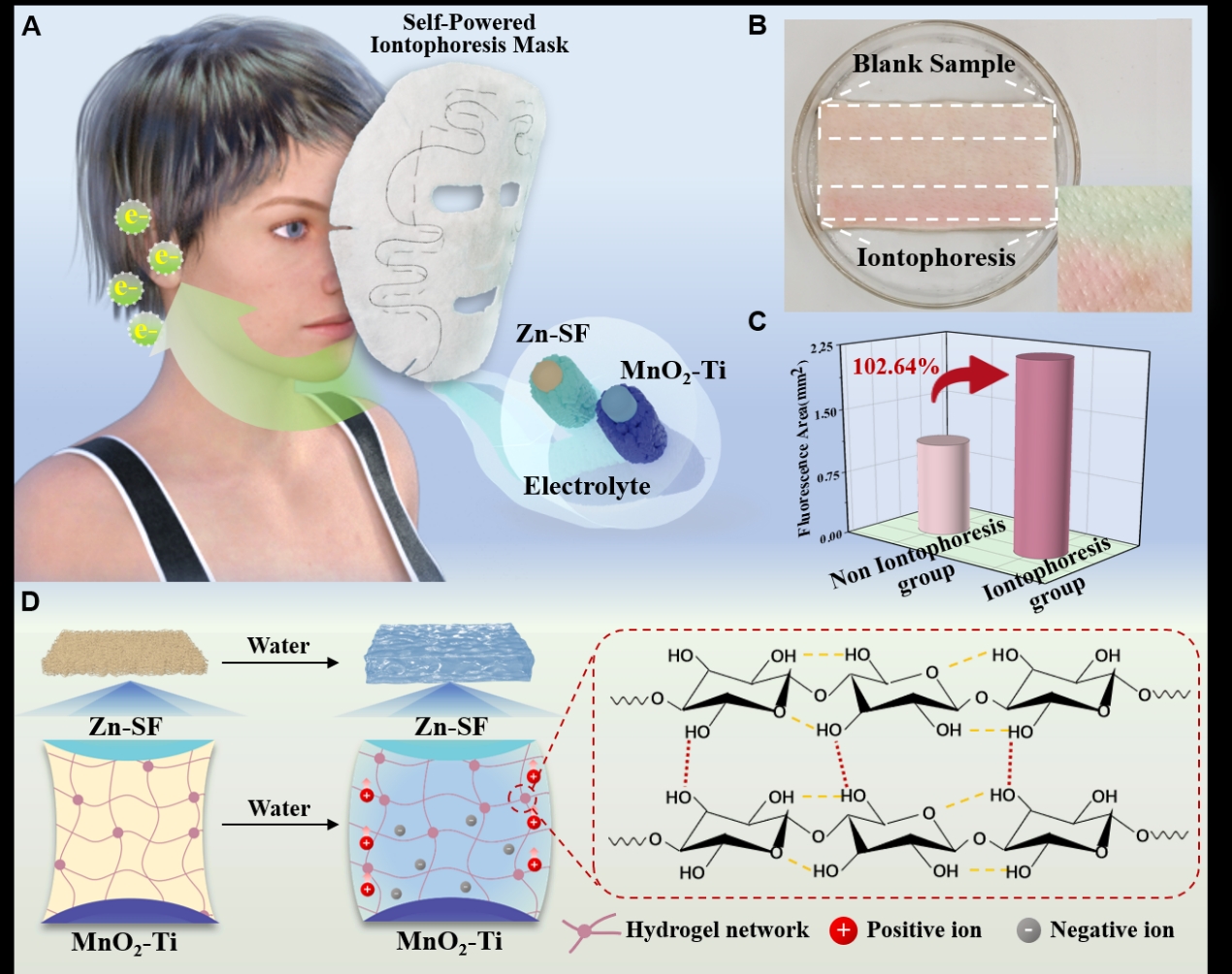 覆盖在皮肤上的面膜能够用来解决面部皮肤问题。通过药物小分子经透皮渗透输送,实现祛痘、美白、补水、提亮等功效。近年来,离子透入技术的引入为提升面膜药物渗透性能提供了新的思路。该技术通过在皮肤表面施加低强度电场,促使药物以离子形式透入皮肤组织,从而在愈合伤口、促进角质细胞迁移、促进肌肉运动以及恢复肌肤弹性等方面展现出更高的效率。所提出的基于锌锰纤维电池(Zn-Mn@FB)的自供电离子电泳面膜(图1),可实现增强透皮给药的功效。