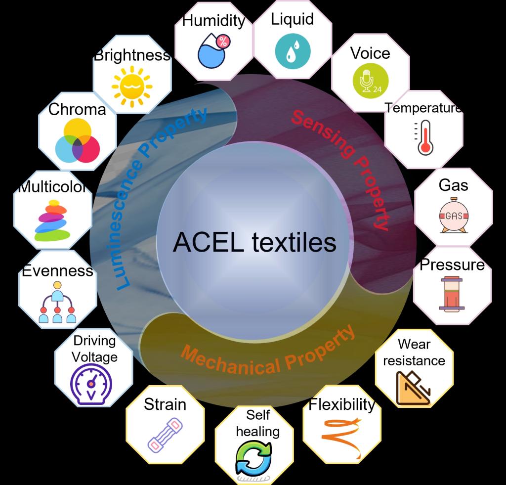 视觉交互纺织品可通过发光来检测和响应物理/化学变化,并在运动传感、医疗保健和安全防护等场景具有广泛的应用价值(图3)。与光致发光、机械致发光或热致发光器件相比,交流电致发光(ACEL)纺织品凭借其柔性、稳定性、功能集成性成为可穿戴视觉交互设备的最佳候选。然而,ACEL纺织品通常需要集成多个电子元件来实现视觉交互功能,存在厚度增加、灵活性降低、交互延迟等弊端。追求轻量化和结构简化对于增强功能和优化交互效果至关重要。