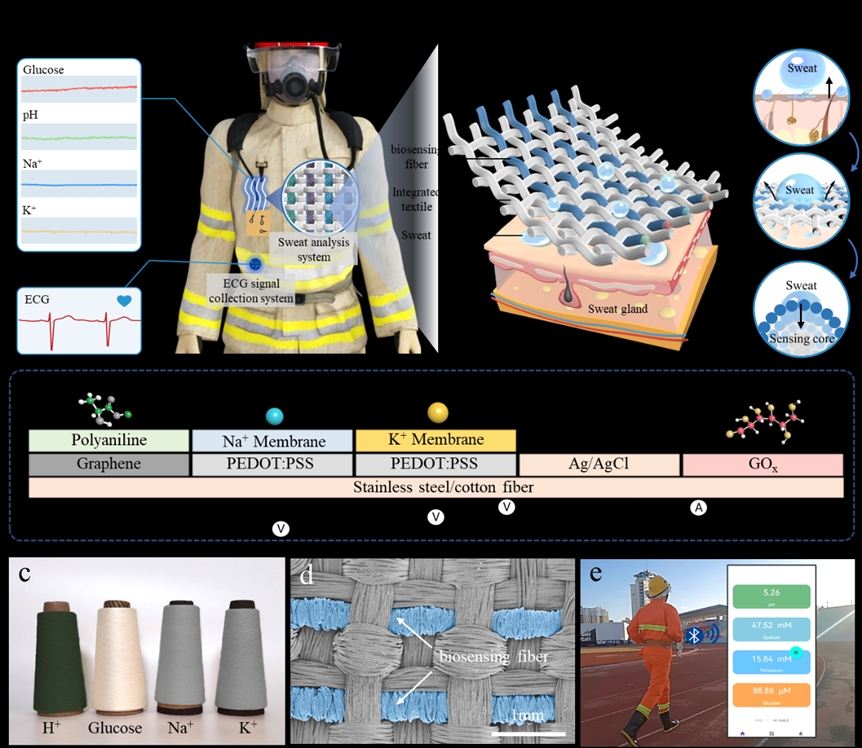 热衰竭是消防员在高温环境中作业时常见的高危病症,其特征是脱水、心率过快和电解质失衡。若未及时干预可能迅速演变为致命性热射病(死亡率高达70%)。传统消防服功能单一,无法实时监测体液成分与生理指标,导致健康风险难以及时识别。所提出的基于湿润梯度效应的超灵敏生物传感服装(图2),实现了五项关键生物标志物(pH、钠、钾、葡萄糖、心率)的同步监测。