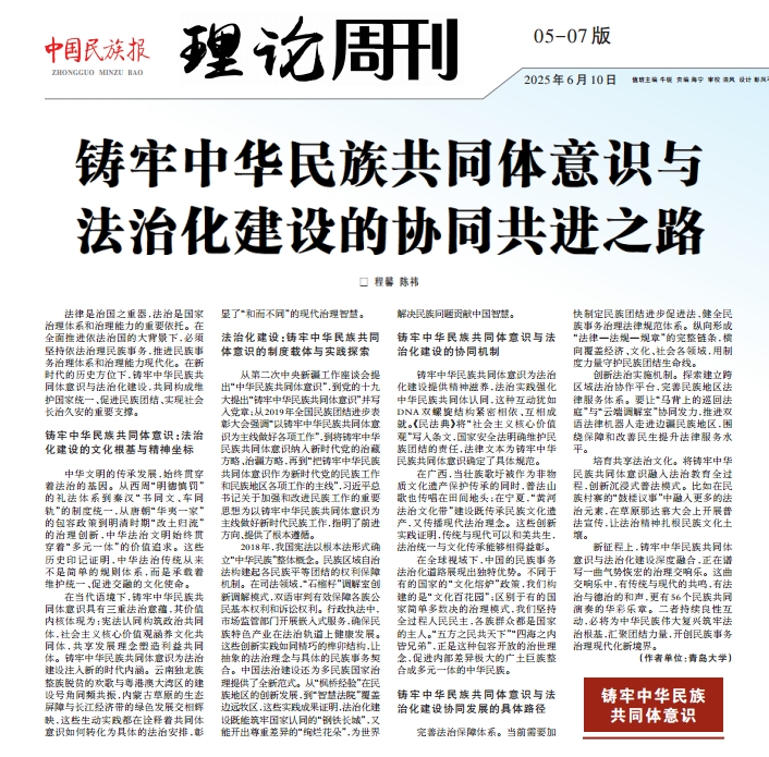 新闻网讯 6月10日,beat365商学院副教授程馨团队在《中国民族报》理论周刊发表了题为“铸牢中华民族共同体意识与法治化建设的协同共进之路”的文章,引发社会关注,并被中国民族宗教网全文转载。
