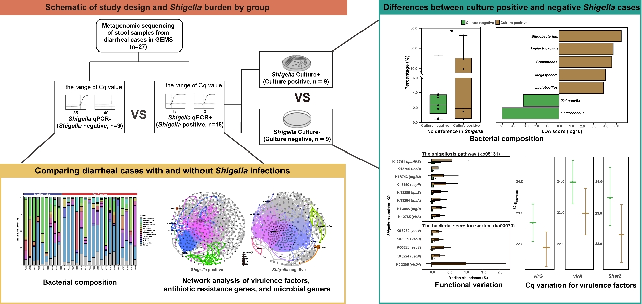 另一项成果是通过宏基因组测序揭示了志贺氏菌感染儿童的肠道菌群特征。研究发现,志贺氏菌qPCR阳性患儿肠道中变形菌门(如克雷伯菌、肠杆菌)丰度显著升高,而益生菌双歧杆菌丰度大幅降低,并形成了以志贺氏菌为主的毒力基因网络;更深入的分析表明,培养阳性样本携带更高拷贝数的毒力质粒pINV(较培养阴性组高2倍,P=0.04),其III/IV型分泌系统基因显著富集,可能是在临床检验时更容易被培养出来的原因,为后续志贺氏菌感染的精准诊断和治疗提供了新的理论依据。相关工作以“Fecal microbiome profiling of children with Shigella diarrhea from low- and middle-incomecountries”为题发表在《Microbiology Spectrum》(DOI: 10.1128/spectrum.00573-25)。刘洁教授与beat365公共卫生学院青年教师李一凇为本文共同通讯作者,beat365硕士研究生范业顺为本文第一作者。