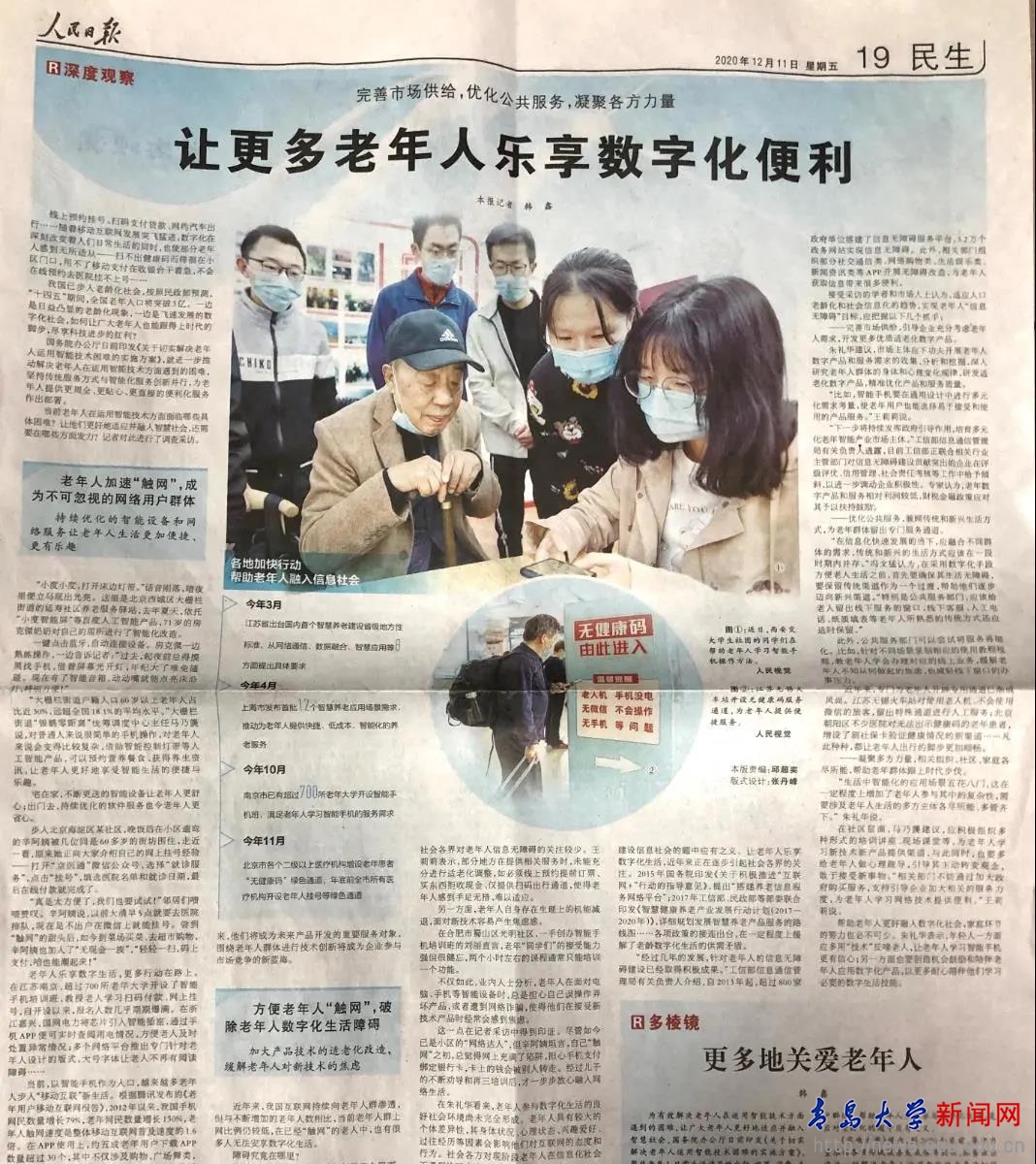 近年来,商学院智慧健康老龄化研究中心以“数字化进程中的老年人”为研究重点,在国家社科基金《代际“数字鸿沟”对老年人再社会化影响的随机实验干预研究》和山东省自科基金《数字智能对老年人社会参与的影响机制研究》的支持下,以“全龄包容、多元共享”理念为引领,以“深入基层、切近老人”行动为路径,以“青少年老龄化国情教育和为老服务”融合为特色,不断开拓创新。现今,中心“一心三通”——以推动社会成功老龄化为中心,上下贯通、横向打通、代际融通——工作模式初步成型,社会效益逐步展现,社会影响逐渐提升,得到越来越多的社会支持和认可,并被誉为本年度国务院45号文《国务院办公厅印发关于切实解决老年人运用智能技术困难实施方案的通知》(国办发〔2020〕45号)的积极推动者。
