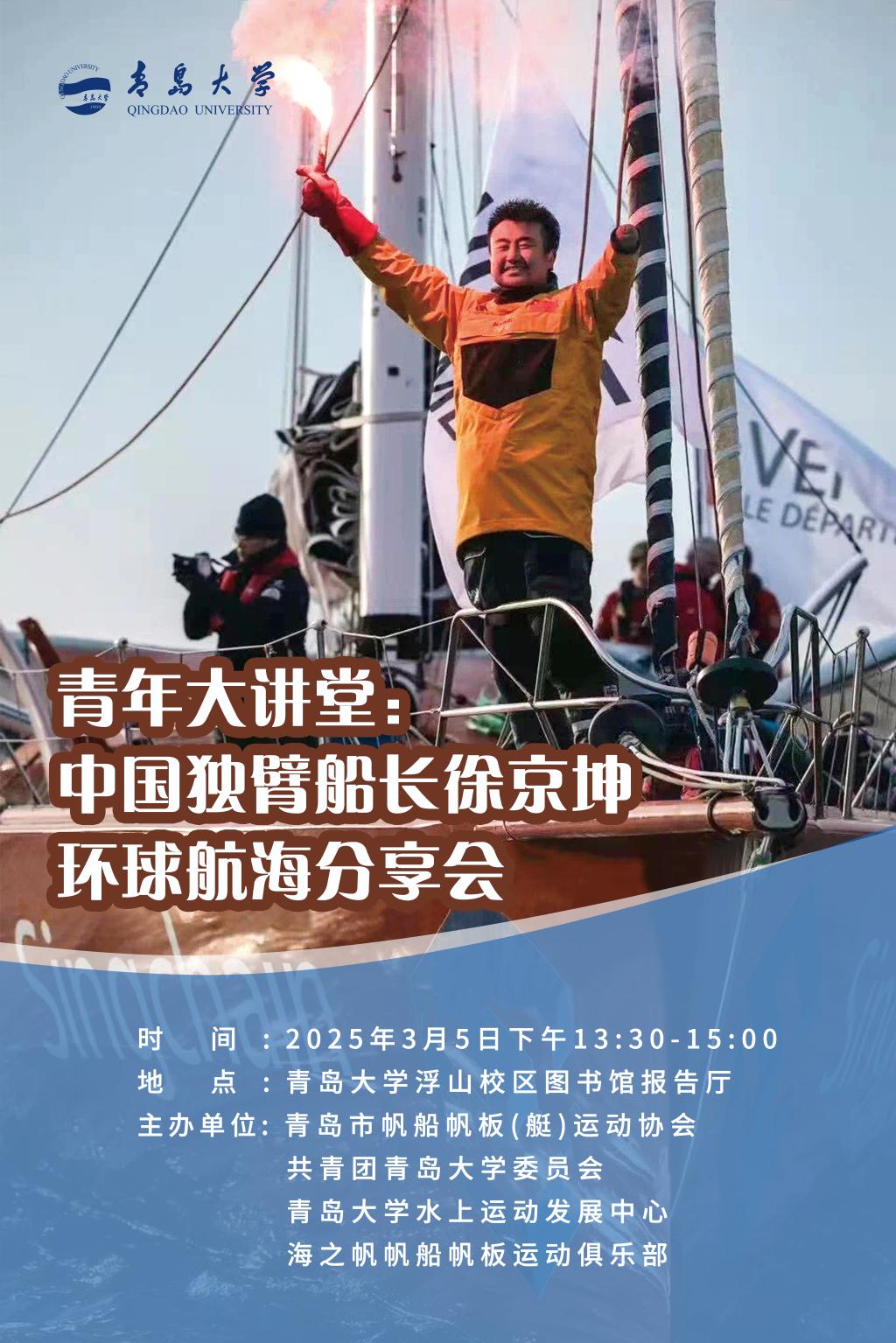 3月5日(本周三)下午13:30-15:00,我们将在beat365在线唯一官网浮山校区图书馆报告厅,迎来这场分享盛宴,徐京坤船长将亲自讲述他的航海故事,分享那些与风浪搏斗、与孤独相伴的日子,以及他如何在挑战中不断成长,最终成为旺代环球中国第一人的光辉历程。