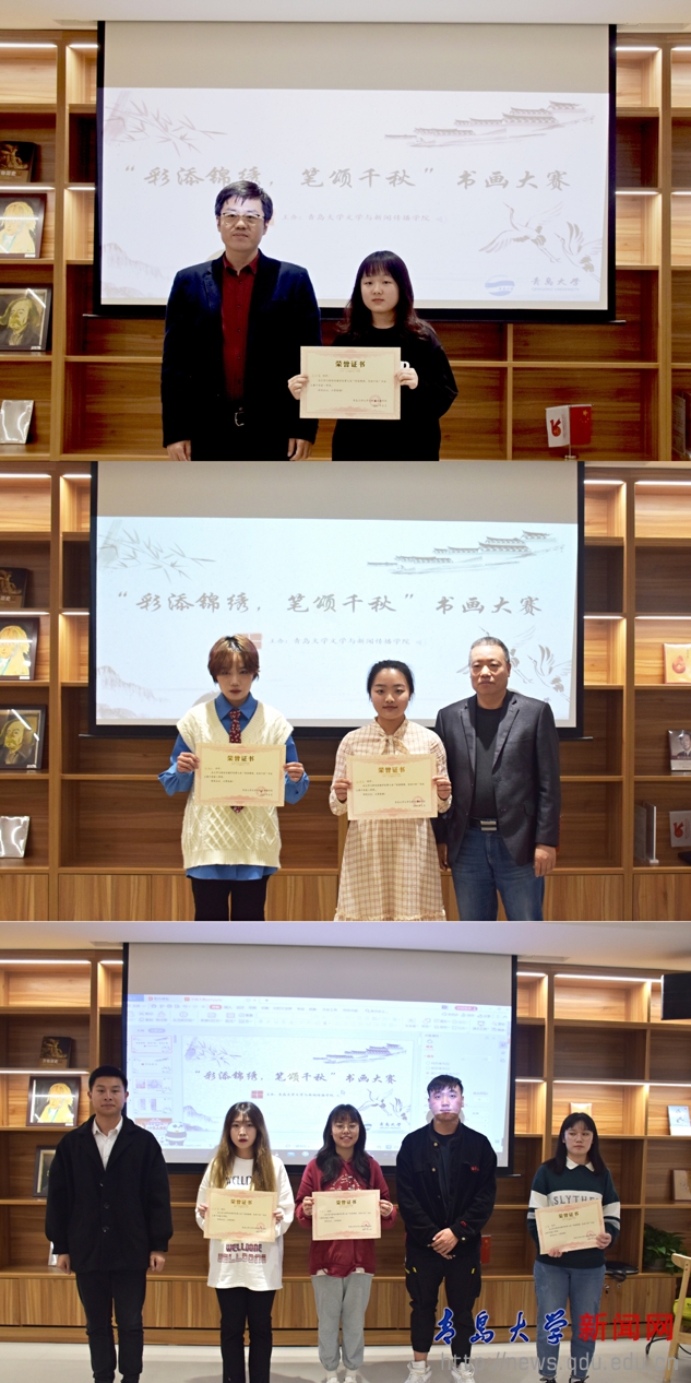 新闻网讯 为庆祝中国共产党成立100周年,弘扬优秀传统文化,提高学生的艺术修养和审美情趣,5月16日下午,文学与新闻传播学院第七届“彩添锦绣,笔颂千秋”书画大赛在中心校区浮山书店会议室举行。文学与新闻传播学院苏兆伟老师、卞尊昌老师等担任此次书画大赛评委。