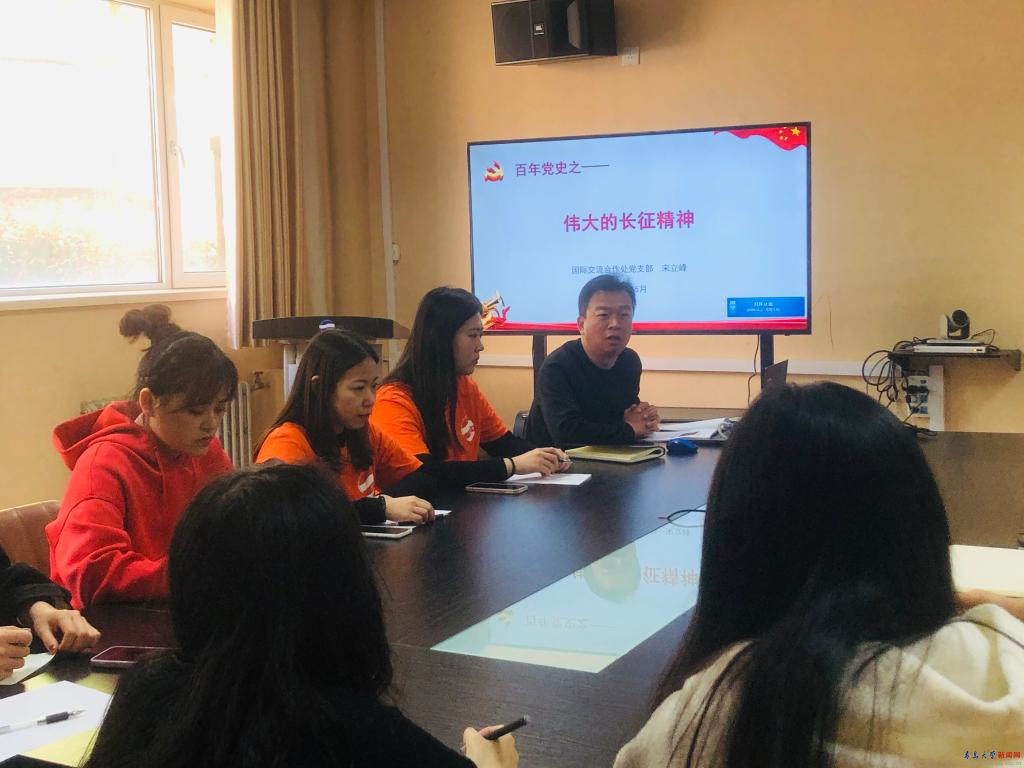 国际交流合作处副处长宋立峰作了关于“百年党史——伟大的长征精神”的专题党课,他从“长征”、“毛泽东诗词里的长征”和“学习感悟”三个方面为大家讲述了长征精神,特别是在“毛泽东诗词里的长征”这一部分,把毛泽东在长征每个阶段所写的诗词进行了详细讲解,让大家对长征的历史以及“长征精神”的实质和内涵有了更为深刻地了解与认识。最后,从广义长征和狭义长征两个角度,分享了自己的感悟,鼓励大家为实现理想目标要不断艰苦奋斗,把长征精神融入到日常的学习、工作和生活中。