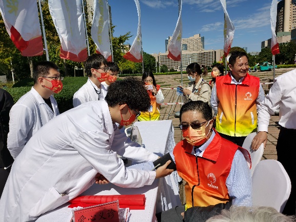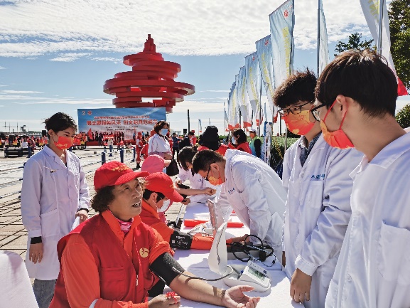 活动现场,医诚志愿服务团成为大家关注的焦点,志愿者们分工合作,开展爱心义诊活动,吸引了众多的市民前来问诊。志愿者们充分运用专业的医学知识和技能,为老年市民及现场其他团队志愿者们提供免费血压测量、心率测定、常见病的健康讲解等服务,并发放急救知识传单。志愿者们也细致耐心地回答了市民们咨询的各种健康问题,解除大家对疾病的疑惑,受到了老年人的一致欢迎。