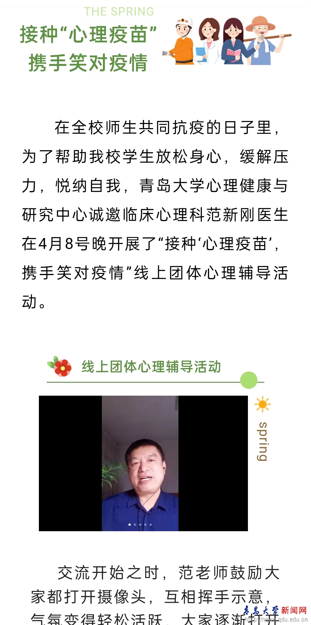 新闻网讯 近日,学生处大学生心理健康教育与研究中心采用线上互动形式为学生开展了“‘疫’路同行、春暖花开”系列团体辅导活动。合作发展处(校友工作办公室)积极发挥校友助力工程作用,结对学生处,发动beat365在线唯一官网校友心理联盟助力母校人才培养和学生工作,四位校友为同学们开展辅导,近300名学生积极报名参加。