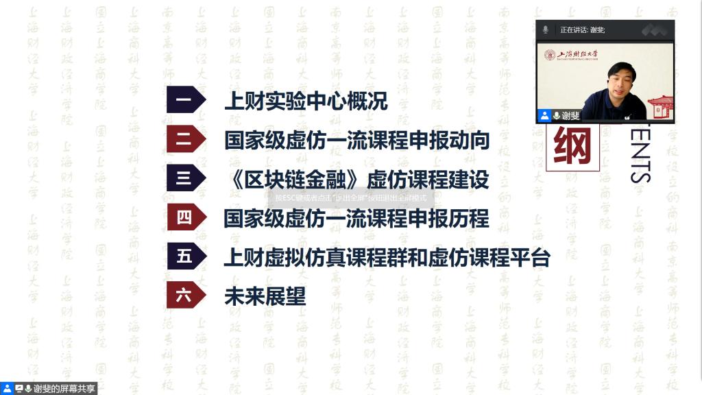 谢斐副主任从全校实验体系搭建者和国家级“金课”建设者两个角度,先后介绍了国家级虚拟仿真一流课程申报动向、《区块链金融》虚仿课程建设经验、国家级虚仿一流课程申报历程、上财虚拟仿真课程群和虚仿课程平台建设现状等多方面的内容。谢斐副主任的报告精彩纷呈,既有顶层设计的逻辑思考,又有课程建设的实践细节,既有对经验的系统总结,又有对未来的科学规划,引发了参会者的强烈共鸣和热烈讨论,使大家受益匪浅。