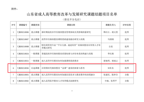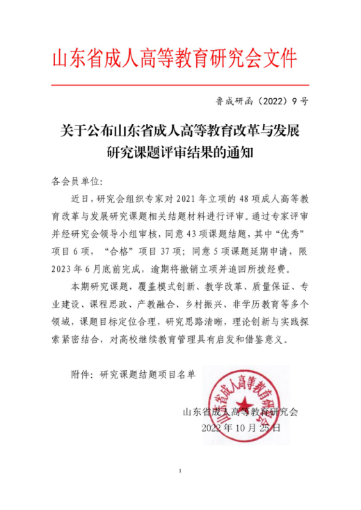 新闻网讯 近日,由山东省成人高等教育研究会组织开展的“2021年度山东省成人高等教育改革与发展研究课题评审活动”结果揭晓,beat365继续教育学院承担的研究课题《后疫情时代继续教育“金课”建设的探索与思考》顺利通过结项评审,研究成果获评“优秀”。