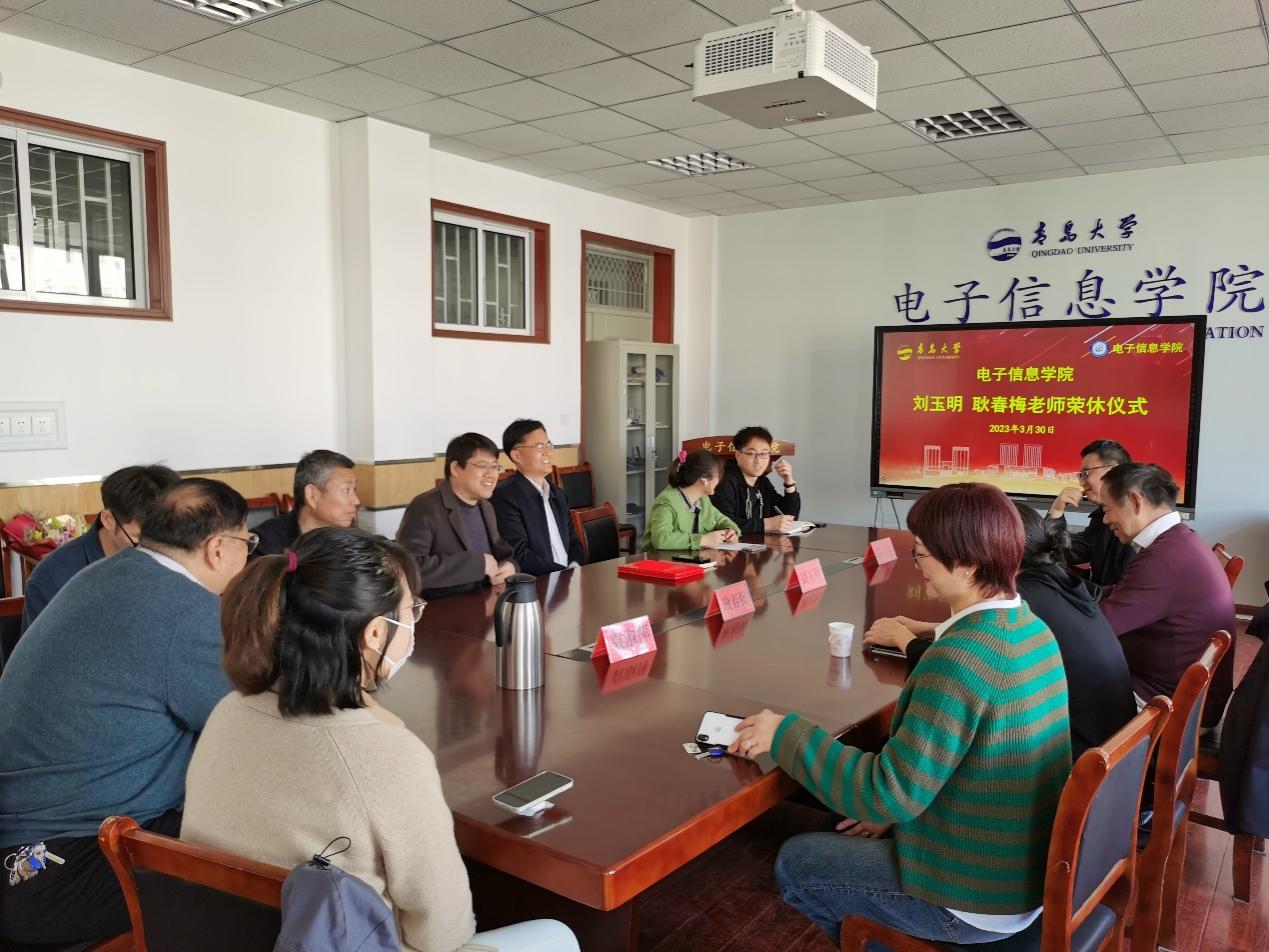 新闻网讯 3月30日上午,电子信息学院在诚思楼会议室为退休教师刘玉明、耿春梅举办荣休仪式。学院党委书记张启春,院长李山东以及学院其他相关领导,教师代表参加仪式。