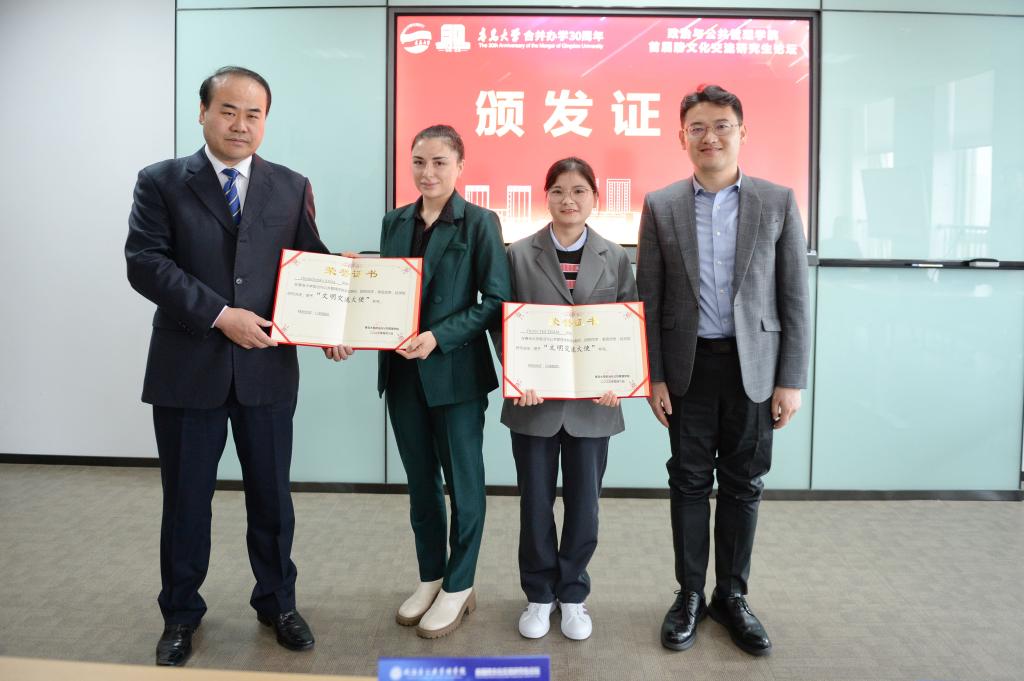 开幕式上,汪运波为首届跨文化交流研究生论坛发表致辞,陈洪连介绍政治与公共管理学院国际化办学成效,汪运波与周允旭为政治与公共管理学院2020级国际关系专业越南留学生陈氏深(TRAN THI THAM)和乌克兰留学生阿丽娜(Onishchenko Aryna)颁发政治与公共管理学院“文明交流大使”证书。