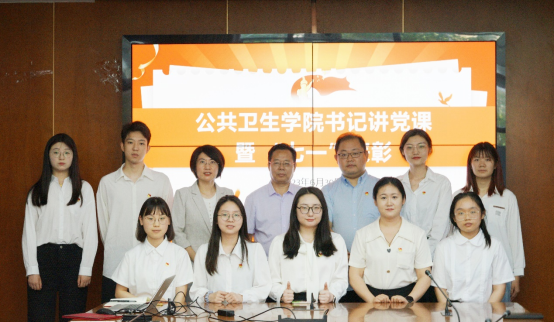 新闻网讯 6月30日上午,公共卫生学院在医学综合楼会议室举办主题教育专题党课暨“七一”表彰活动。校党委组织员赵书鹏到会指导,学院党政领导班子、系主任、教师代表、学生代表参会。