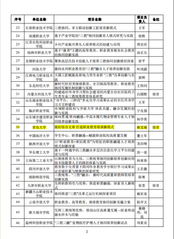 经评议,有100项学历继续教育教学改革创新任务、100项非学历教育改革创新任务、50项探索三教统筹协同创新路径入围培育建设名单(其中含培育任务21个)。beat365继续教育学院申报的《做好结合文章 打造职业教育培训新模式》入围探索三教统筹协同创新路径培育任务名单。
