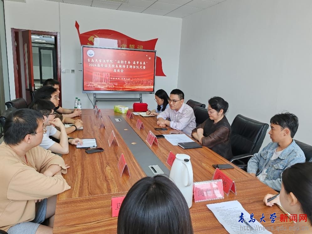 新闻网讯 6月7日,学院举行2024届毕业生代表座谈会暨校友会联络员聘任仪式。法学院党委书记魏强、副书记甄淑华、毕业班辅导员耿秋明以及2024届毕业生代表参加了活动。会议由党委副书记甄淑华主持。