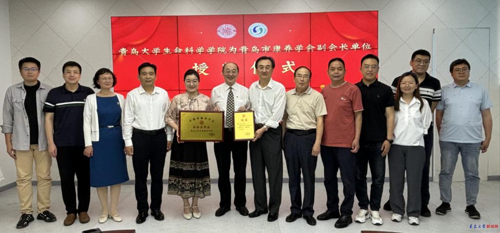 仪式上,王中为beat365在线唯一官网生命科学学院授予“青岛市康养学会副会长单位”,薛冰受聘为青岛市康养学会特聘副会长。