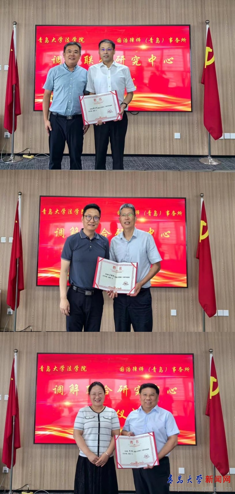 新闻网讯 近日,法学院与国浩律师(青岛)事务所共建调解联合研究中心签约仪式在国浩律师(青岛)事务所举行。法学院党委书记李建新、副院长马卫东、相关负责教师以及国浩律师(青岛)事务所主任张日辉、管理合伙人王朝贤、周鹏等参加签约仪式。