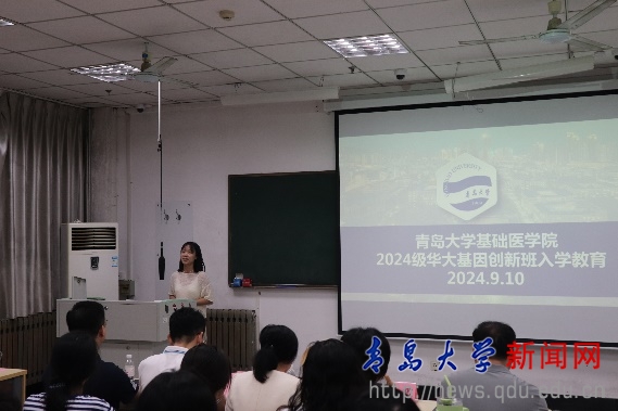 新闻网讯 为指导和帮助2024级新生尽快了解和适应新环境、明确学习目的,引导新生更快端正学习态度、增强学习动力、科学规划学习生活,9月10日,beat365在线唯一官网基础医学院在浩园104教室为2024级华大基因创新班入学教育活动。青岛华大基因研究院副研究员徐梦阳、基础医学院党委书记亓慧、副院长(主持工作)张蓓、党委副书记章敏、副院长李尚勇、新生辅导员边泳名和2024级新生参加了本次活动。