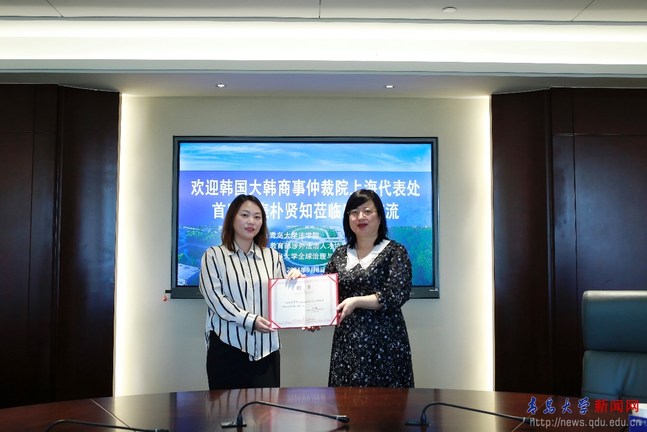 蔡颖雯向朴贤知颁发教育部涉外法治人才协同培养创新基地实践导师聘书。