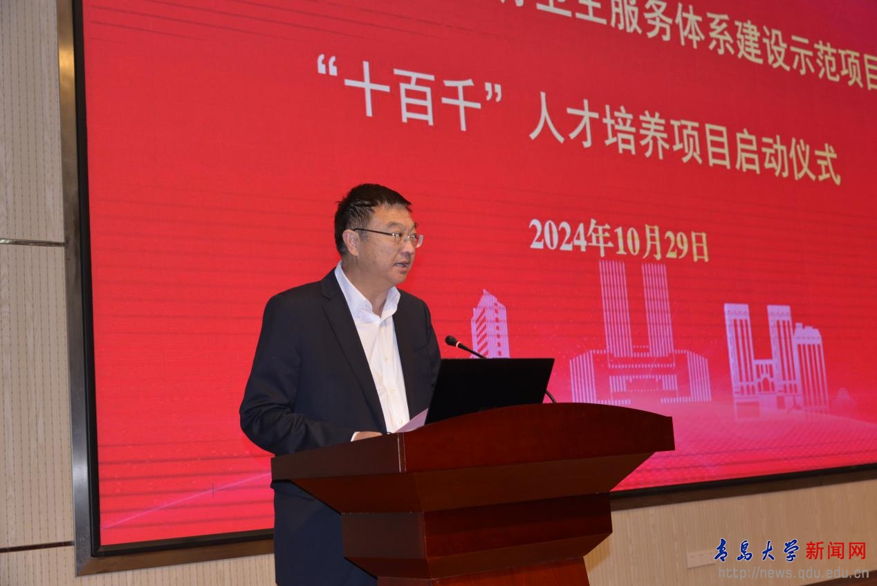 蒋光峰介绍了青岛医学院的基本情况。他表示,此次承接“十百千”人才培养项目是青岛医学院服务区域医疗卫生事业的重要机遇,学院将整合优秀的师资团队、教学资源、教学设施和临床技术,为学员提供全方位规范化的系统培训,打造青医培训品牌,创造基层医疗卫生人才培训的新模式。他表示,期待青岛医学院能进一步加强与青岛市各级医疗卫生系统的深度合作,承接更多的基层医疗卫生人才培训任务,为推进青岛医疗卫生健康事业高质量发展、为增进岛城人民的健康福祉作出更大的贡献。