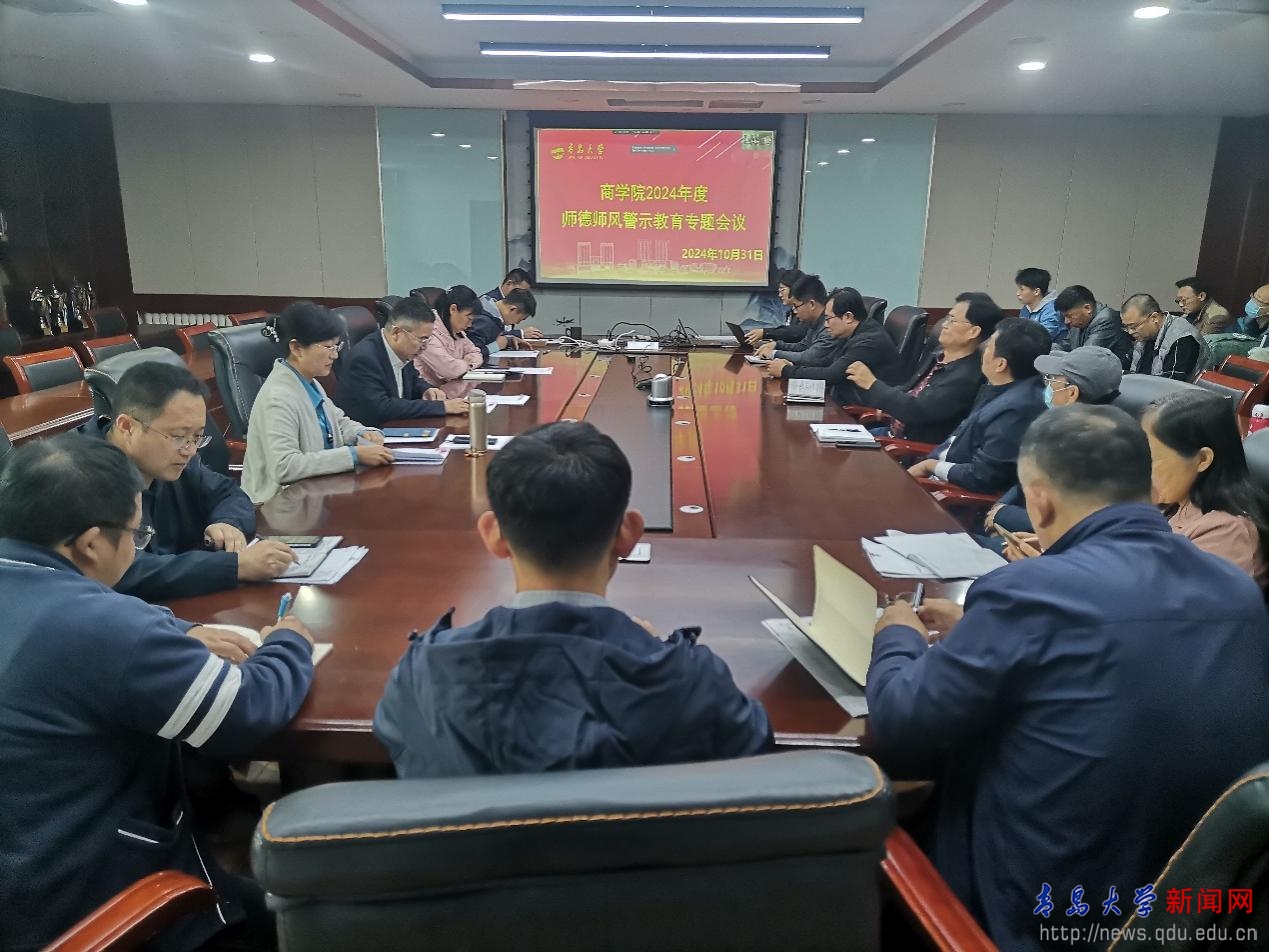 新闻网讯 10月31日,商学院在310会议室召开商学院“传承教育家精神 铸就高尚师德”主题教育暨2024年度师德师风警示专题教育,全院教职员工线上线下同步参会,院党委书记王庆金主持会议。