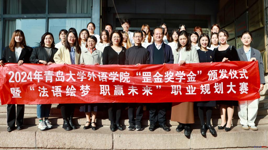 新闻网讯 10月31日下午,外语学院2024年“罡金奖学金”颁发仪式在博文楼312教室隆重举行。青岛罡金国际合作服务有限公司总经理夏纲举、人力部副经理刘玉媛,学校合作发展处、学生工作处及外语学院负责人参加仪式。仪式由外语学院党委副书记于苗主持。