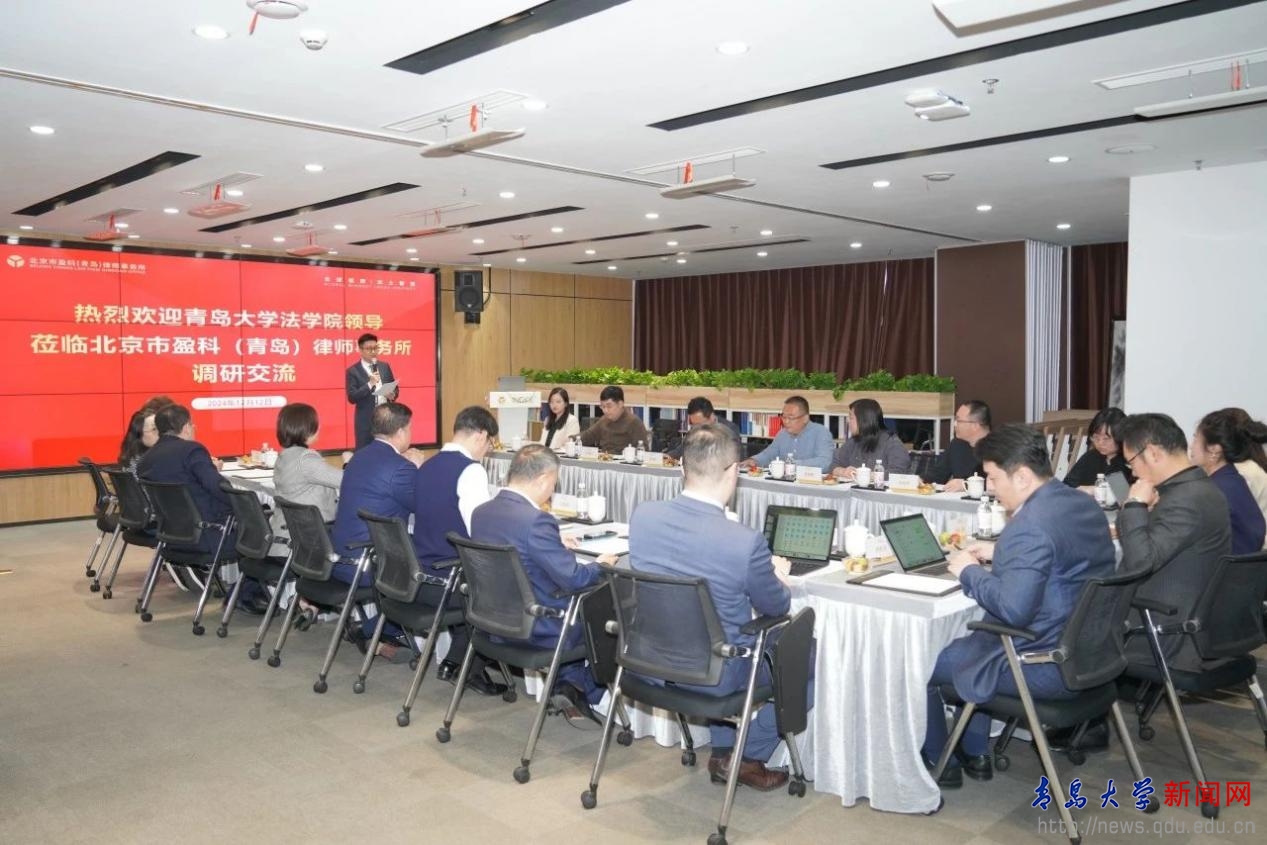 新闻网讯 为深化高校与实务部门双向交流,拓展学生实习实训和就业基地建设,近日,法学院党委书记李建新一行到北京盈科(青岛)律师事务所(以下简称“盈科青岛所”)走访调研。盈科青岛所执行主任于靖、所党总支书记黄永超、监事会主任查俭、高级合伙人马国庆、高级合伙人郝兴利、高级合伙人伊廷科、在盈科青岛所兼职的法学院教师、在盈科青岛所工作的法学院毕业生代表以及盈科青岛所青年律师代表参加调研活动。