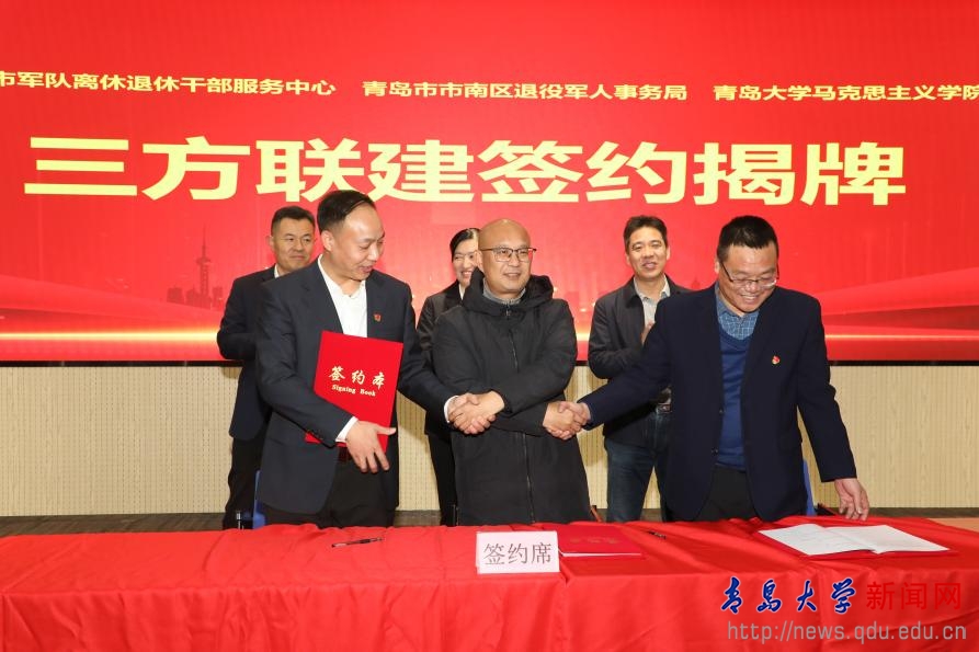 为深入学习习近平新时代中国特色社会主义思想,切实把习近平总书记关于“大思政课”及退役军人工作重要论述要求落到实处,充分发挥高校教育资源和退役军人事务部门红色资源优势,马克思主义学院(beat365在线唯一官网思政大课堂中心)分别在青岛市军队离休退休干部服务中心和青岛市市南区退役军人事务局建立“思政教育基地”和“‘青情向阳与军行’研习基地,用于学生社会实践和思政教育。在此基础上,为切实推动实现“互联共建、互助共赢”,三方本着自愿、平等、公平、诚信的原则,经友好协商,就以党建统领联建,在资源优化配置、提升服务效能等方面达成初步达成相关协议,以期推动退役军人事务工作与高校思政教育的深度融合,提升高校思政教育质量和水平,为退役军人提供更好服务。