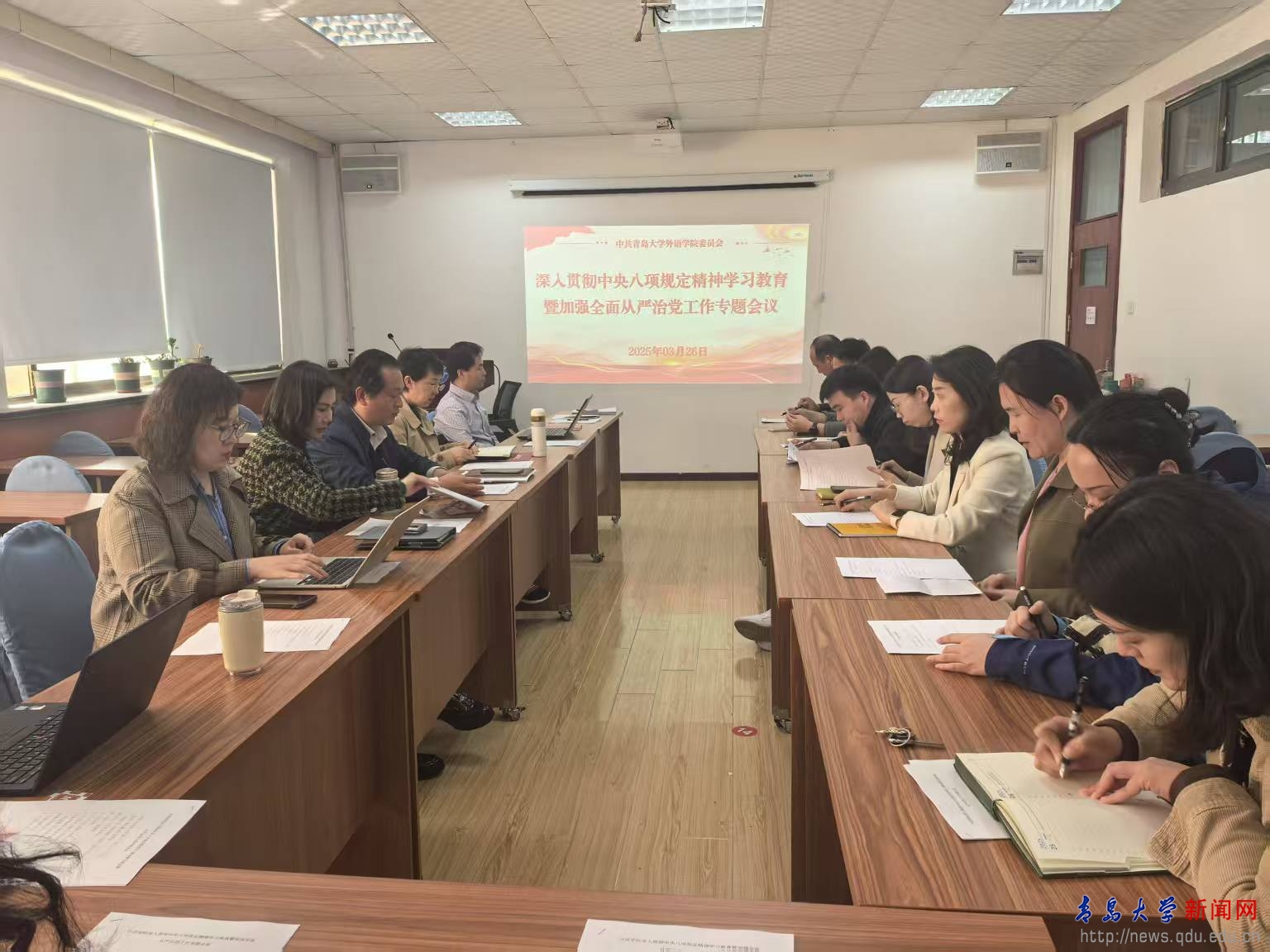 新闻网讯 3月26日下午,外语学院党委在博文楼312会议室召开深入贯彻中央八项规定精神学习教育暨全面从严治党专题会议。学院党委委员、各党支部书记、各教学系负责人参加会议,会议由学院党委书记陈崇研主持。