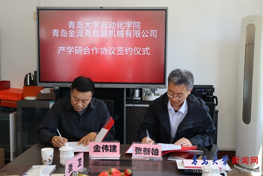 新闻网讯 4月25日上午,自动化学院与青岛金派克包装机械有限公司在青岛金派克包装机械有限公司会议室,围绕产学研合作展和毕业生就业开展座谈研讨。自动化学院党委书记张新柏、党委副书记于宏及学院教师代表,青岛金派克包装机械有限公司董事长金伟健、青岛紫文管理咨询有限公司董事长杨德才及两公司相关工作人员参会。座谈会由杨德才主持。