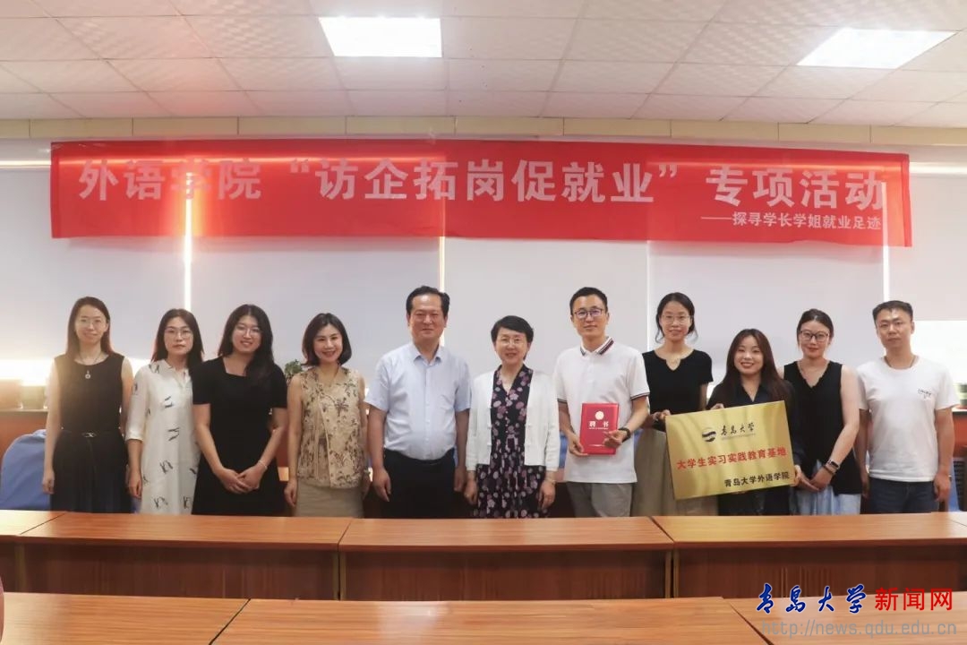 双方签订“人才培养基地”合约书,外语学院向企业授牌“大学生实习实践教育基地”,向吴泽颁发校外就业指导教师聘书。