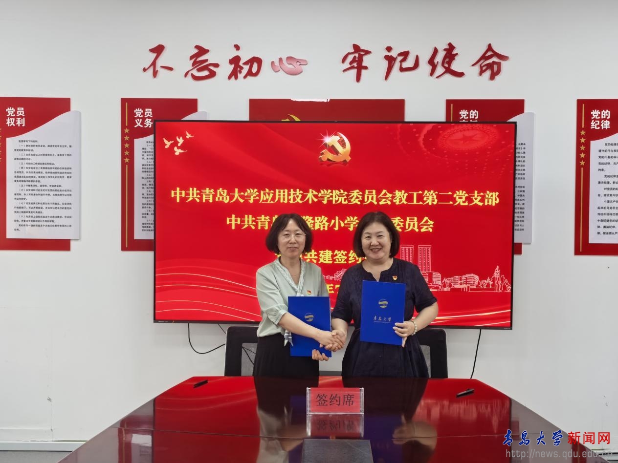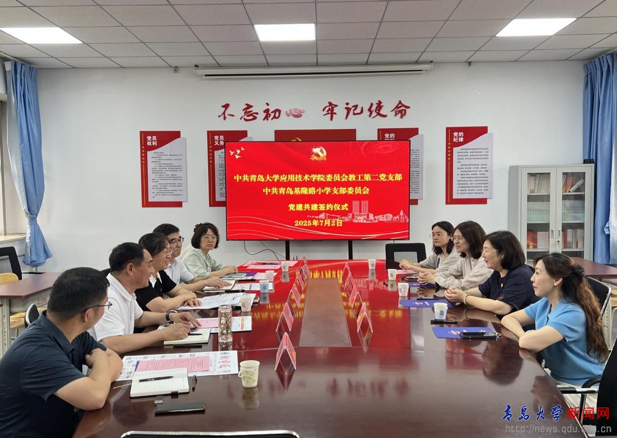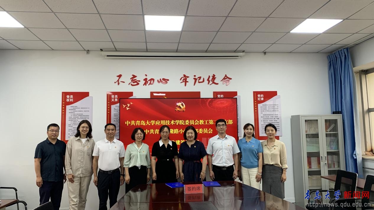 新闻网讯 近日,应用技术学院教工第二党支部与青岛基隆路小学党支部党建共建签约仪式在金家岭校区举行。应用技术学院党委书记张燕、副院长初金涛、教工第二党支部书记初秀荣,青岛基隆路小学党支部书记、校长邱琳,副书记乔静,副校长吕倩参加活动。活动由教育培训中心主任韩继雨主持。