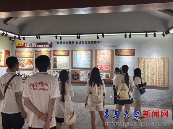 7月9日,实践团来到位于临沂大学的山东革命金融博物馆。步入展厅,毛泽东同志“发展经济,保障供给”的题词与习近平总书记“金融是血脉,经济是肌体”的论述遥相呼应,在时空交错中勾勒出中国共产党金融思想一脉相承的理论图谱,为新时代金融学子理解红色金融的初心使命提供了思想坐标。