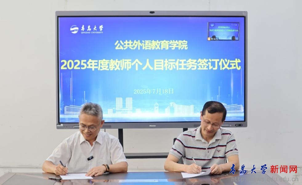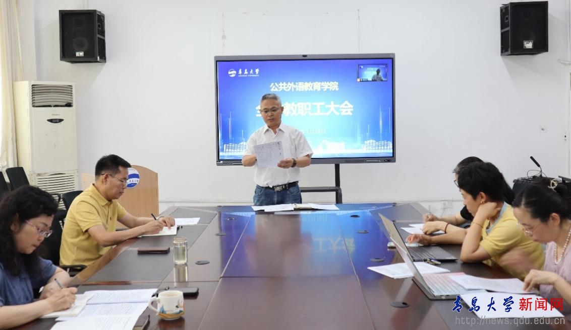 新闻网讯 7月18日上午,公共外语教育学院在睿思楼202会议室举行全体教职工大会暨2025年度教师个人目标任务签订仪式。院长国林祥主持会议,全体教职工参加。