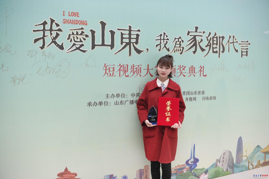 新闻网讯 4月28日,由山东省委宣传部、共青团山东省委联合主办,山东广播电视台融媒体资讯中心、齐鲁网·闪电新闻承办的“我爱山东,我为家乡代言”短视频大赛颁奖典礼在济南举办,文学与新闻传播学院2019级研究生刘楠获得二等奖并现场领奖。