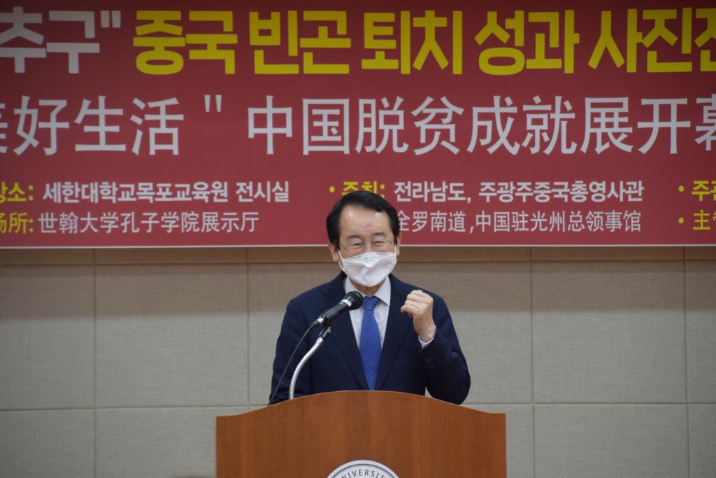新闻网讯 6月7日,在韩国世翰大学孔子学院举行“追寻美好生活”中国脱贫成就展开幕式。本次脱贫成就照片展由中国驻光州总领事馆、全罗南道道厅共同主办,由世翰大学孔子学院承办。张承刚总领事、全罗南道政务副知事宋庠烙、木浦市长金钟植、世翰大学总长李昇勋等全南地区政府机关和文化界、教育界、新闻媒体、华侨代表,留学生代表以及友好团体代表等50多位人士出席。