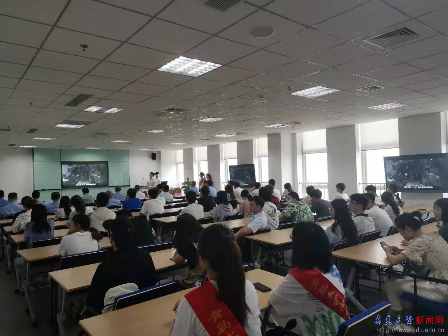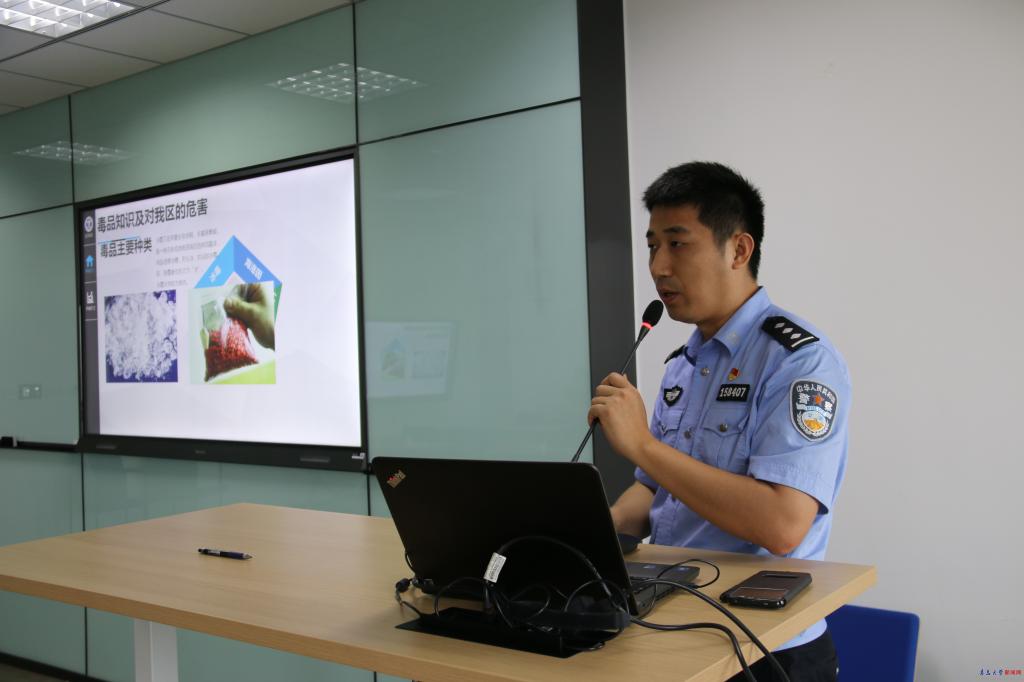 启动仪式结束后,崂山区公安分局禁毒大队韩玉龙为学生禁毒宣传志愿者做了《崂山区禁毒形势及青少年预防教育》的专题培训讲座。