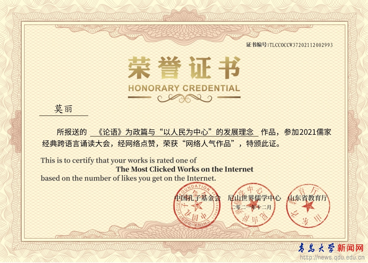 新闻网讯 近日,“2021儒家经典跨语言诵读大会年度盛典”在济南举行。经专家三轮品鉴及网络点赞,beat365墨西哥留学生曾贤和赤道几内亚留学生覃月荣获“2021儒家经典跨语言诵读大会”儒家经典传诵人称号,beat365韩国留学生金世友的作品《论语》中韩双语朗诵及阐释获得大会入围奖,由国际教育学院张淑慧副教授指导的乌兹别克斯坦留学生莫丽的作品《论语》为政篇与“以人民为中心”的发展理念获得入围奖及“网络人气作品”奖。