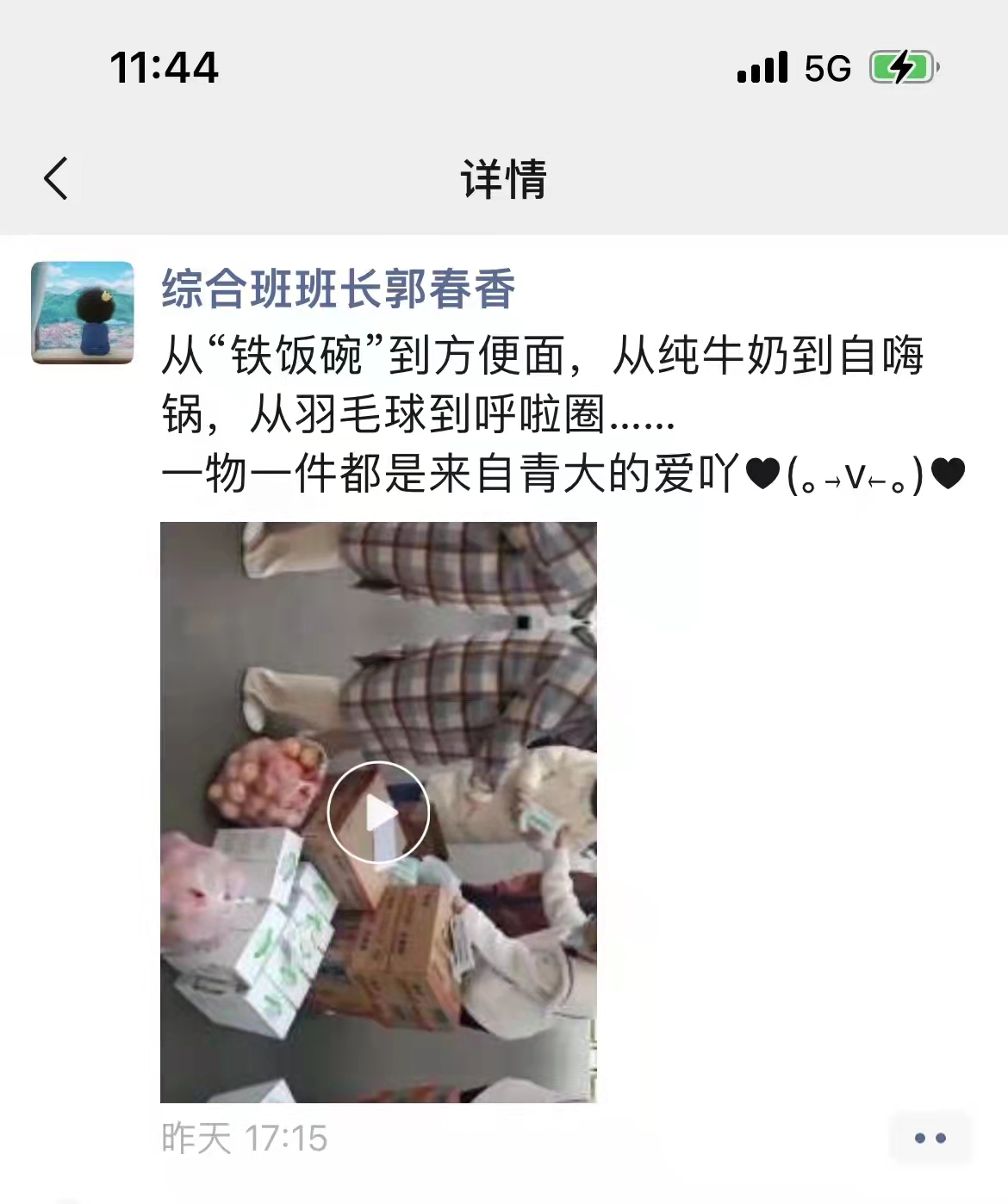 接受捐赠的同学代表向捐赠单位发出了《感谢信》。同学们在信中说:大疫见真情,春日暖人心。疫情之下,学校为了我们的安全,领导老师们与我们一起封闭在校园。松山校区面临后勤服务人员少,生活物资短缺的困难。关键时刻,您们伸出援手,捐赠了食品和防疫物资,为同学们的生活质量改善提供了莫大的帮助。你们的慷慨捐赠让我们感受到了来自社会的关怀与鼓励。这份关怀与鼓励更加增强了全校师生夺取疫情防控胜利的决心和战斗力。我们坚信春日的阳光就在不远处,防疫战争的胜利终将属于我们。等疫情的阴霾散去,青岛依然是红瓦绿树、碧海蓝天,青大校园将更加焕发出勃勃生机、无限活力。