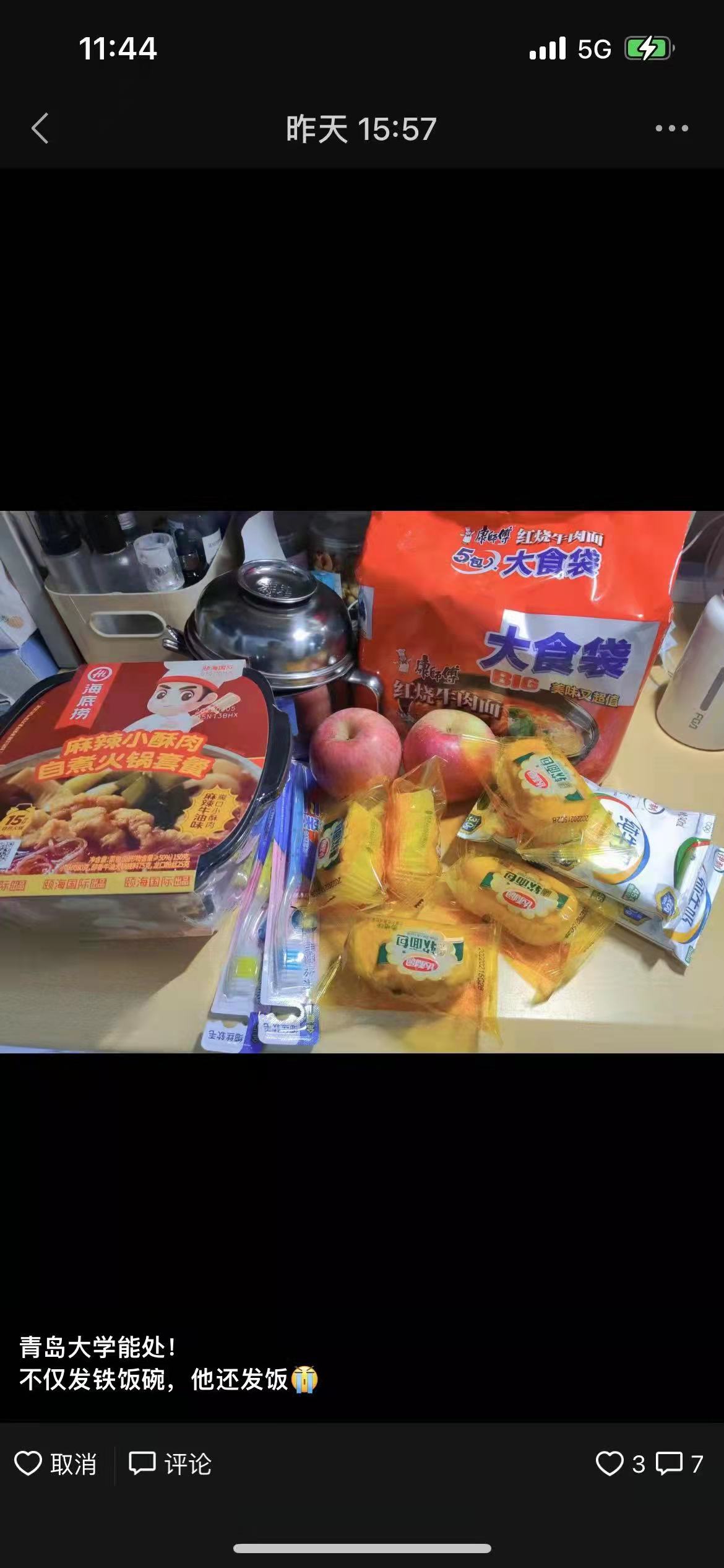 青大正大光明眼科医院黄旭东院长表示,在严峻的疫情面前,人人都是保家卫国的“战士”,作为风雨同舟的兄弟单位,同学们的日常生活也处处牵动着我们的心,本次为同学们提供了自热火锅、牛奶、方便面、水果、口罩等生活必需品和抗疫物资,希望同学们在疫情期间做好个人防护,用强健的体魄和良好的精神面貌去迎接学习生活。
