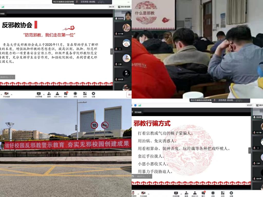 宣传教育活动期间,安全管理处组织在各校区悬挂反邪教警示标语共10余条,发放《崇尚科学,关爱家庭,珍惜生命,反对邪教》的宣传单、宣传挂图3000余份、《beat365在线唯一官网校园反邪教倡议书》2000余份、各类反邪教宣传单品500余份。校学生安防宣讲团积极组织开展反邪教专题学习活动,分别面向师范学院、纺织服装与工程学院的同学们,开展了以“崇尚科学,反对邪教”为主题的线上宣讲活动,组织学生集中观看反邪教警示教育片,切实做到“走进学生、贴近学生”。