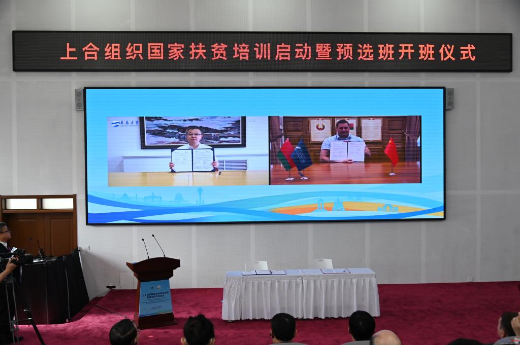 会上,肖江南代表学校与白俄罗斯国立大学教学事务及教育国际化副校长康斯坦丁·科扎达耶夫线上签署双方合作协议。会上还发布了上合组织国家扶贫培训2022年预选班次计划,上合组织国家农副产品贸易培训班(线上)和“科技扶贫”—上合组织国家新一代通信技术培训班(线下)两个班次开班。