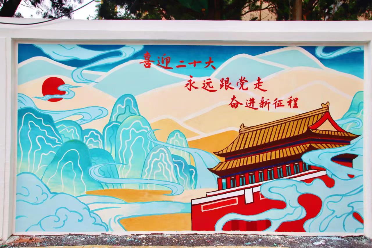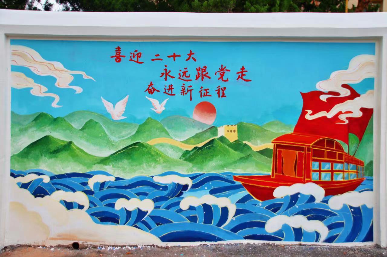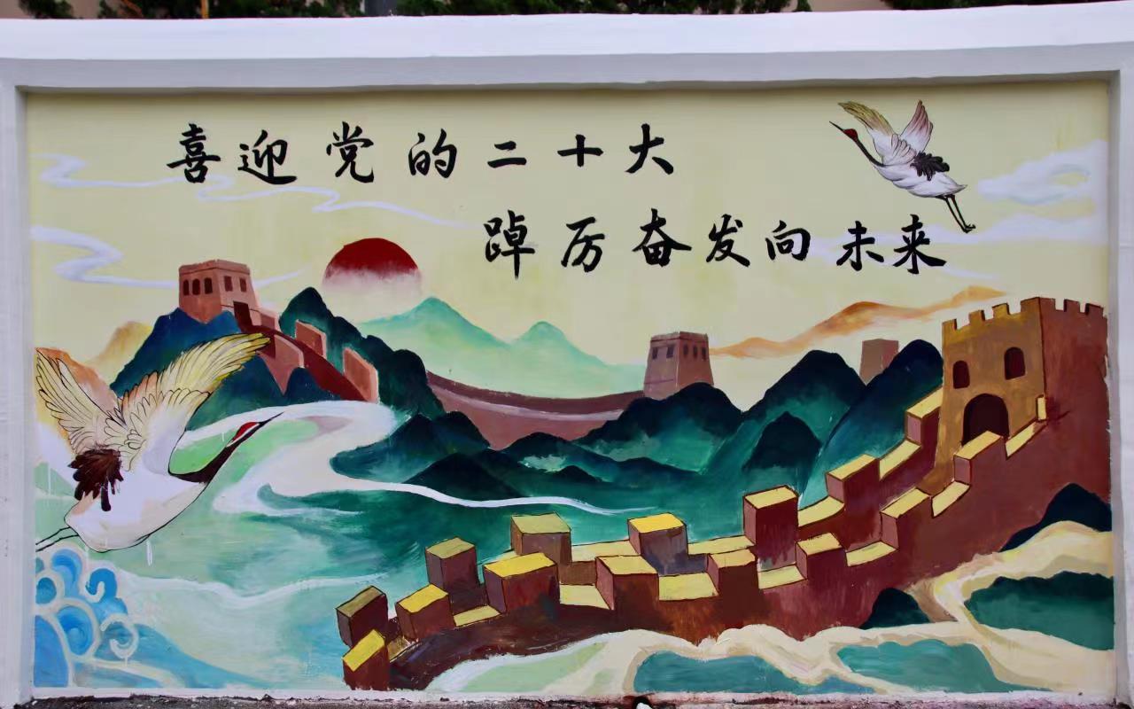 在党的二十大胜利召开之际,绘就锦绣山河,为美丽校园添彩。青山叠翠,风语耳畔,步步皆景,此幅作品以墙绘切入,将绿水青山融汇到墙绘画卷中,成为助力环境保护、生态文明建设的独特载体。