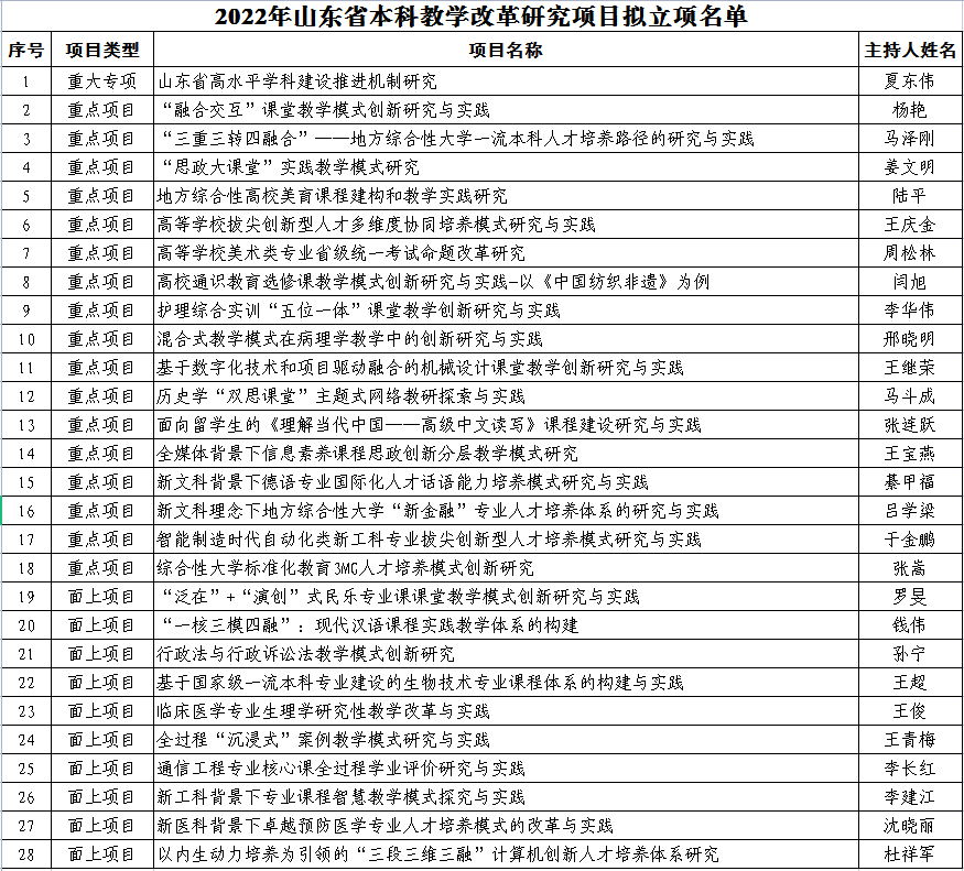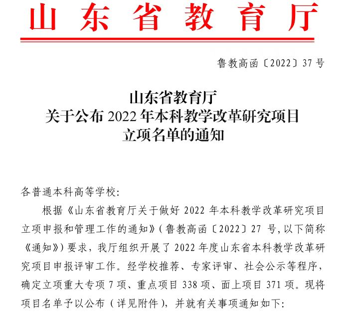 新闻网讯 近日,山东省教育厅公布了2022年本科教学改革研究项目立项名单,beat365推荐的28个项目全部获批立项,其中重大专项一项、重点项目17项、面上项目10项,立项数量位居省属高校第一,全省高校第二,这是beat365获批立项最多的一届。此外,beat365作为联合申请单位获批立项重大专项4项、重点项目5项、面上项目3项。
